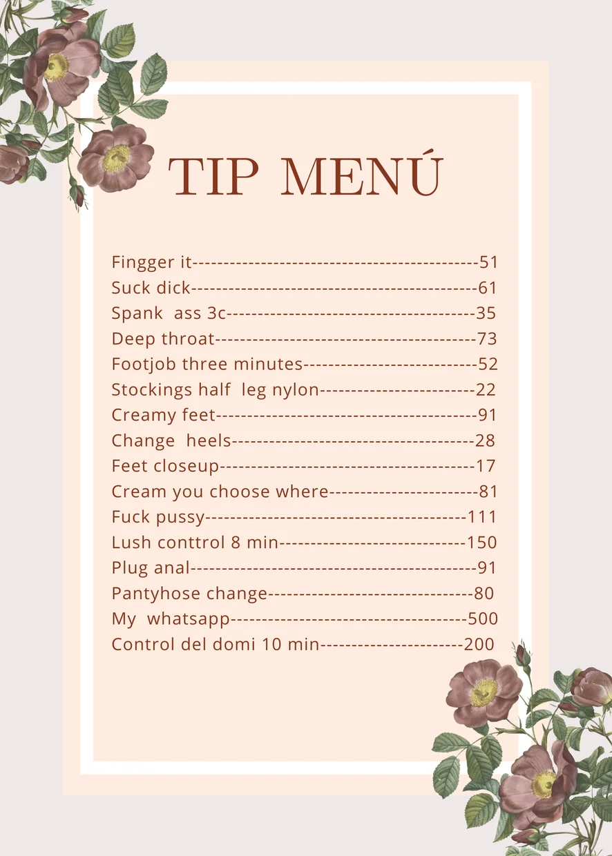 Kutyapóz, Fenekelés, Erotikus tánc, Tevepata, Sztriptíz, Szopás, Maszturbálás, Olajozás, Félmeztelen, Nejlon, Lábfétis, Ujjazás, Mély torok, Orgazmus, Spriccelés, Hardcore, Szexjátékok, Dildó vagy vibrátor, Anál, Dupla behatolás, Anális játékok