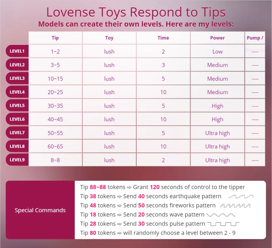 Csókolózás, Ujjazás, Villantás, Lábfétis, Kiverési utasítások, Maszturbálás, Fenekelés, Sztriptíz, Magassarkú, Félmeztelen, Felszarvazott, Iroda, Farok értékelés, Kézimunka, Zuhany, Lovaglás, Dupla behatolás, Öklözés, Szexjátékok, Anális játékok, Mély torok, Kutyapóz, Pumpa, Szopás, 69-es pozíció, Megalázás, Twerk, Mocskos beszéd, Fenékből szájba, Ejakuláció, Hardcore, Lenyelés, Fenéknyalás, Puncinyalás, Élvezés, Arc, Orgazmus